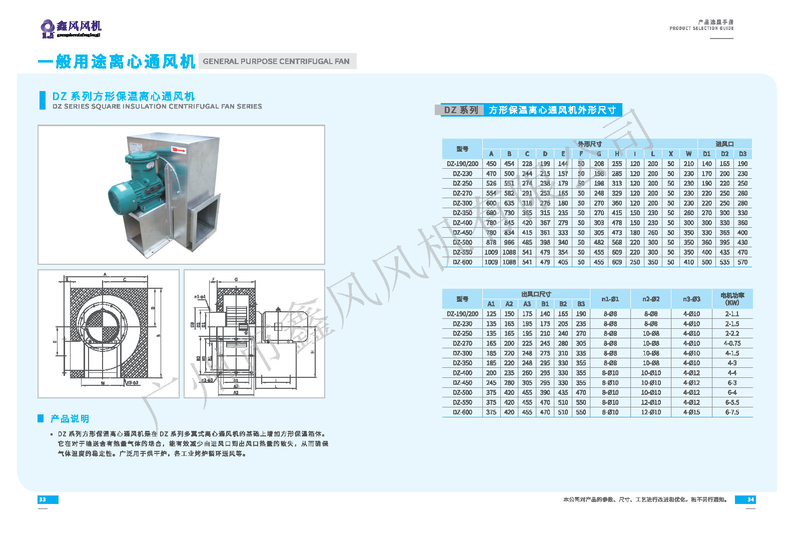 DZ方形保溫離心通風(fēng)機(jī)系列是在DZ系列多翼式離心通風(fēng)機(jī)的基礎(chǔ)上增加方形保溫箱體。